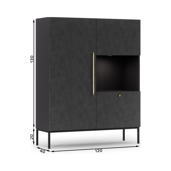 La vetrina Lanzzi del marchio Eltap è un mobile funzionale, elegante e di facile manutenzione per una casa raffinata. Realizzata con una struttura in metallo nero e un pannello in MDF laminato, questa vetrina è robusta e resistente ai danni. Ha quattro ripiani chiusi e uno aperto, oltre a un ampio cassetto con chiusura ammortizzata, che offre molto spazio per organizzare oggetti come vestiti, libri e oggetti decorativi. Le dimensioni del mobile sono 120x40x150 cm, il che lo rende una scelta versatile per il soggiorno, la camera da letto, il corridoio, lo studio o l'ufficio. Sono disponibili due configurazioni di colore: nero con maniglie dorate o nero con frontale in rovere.