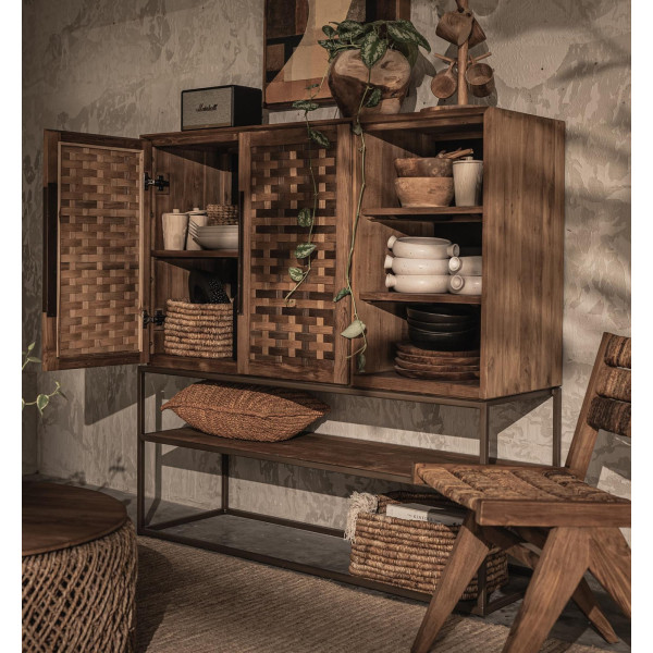 Questo modello di armadio Karma è composto da 2 ante, 3 cassetti con 1 ripiano aperto. Questo mobile è un mobile realizzato a mano in teak riciclato, caratterizzato da una struttura in ferro con una speciale finitura in ottone opaco. È dotato di due ante in teak intrecciate a mano in un colore naturale e tre ripiani per esporre i tuoi tesori preferiti. Il resto dei tuoi effetti personali può essere facilmente riposto dietro le porte splendidamente strutturate. Con una dimensione di 140x45x140 cm, questo mobile è allo stesso tempo grande e bello, perfetto per aggiungere un tocco di stile a qualsiasi stanza