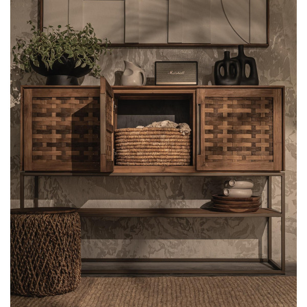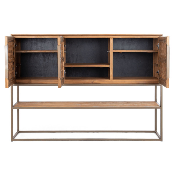 La cassettiera Karma è un elegante mobile vintage realizzato a mano in teak e ferro di recupero. Le tre ante in teak di recupero hanno una bella trama e nascondono sei ripiani rimovibili per riporle facilmente. Il ripiano inferiore è perfetto per esporre i tuoi libri o cianfrusaglie preferiti. La struttura in ferro è rifinita in ottone opaco. L'unità misura 155x40x110 cm.
