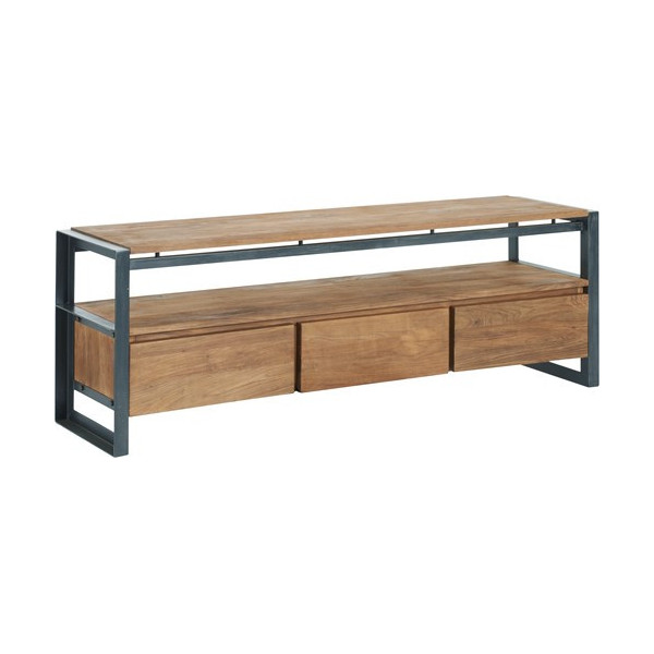 Consolle in teak con una struttura in metallo nero.