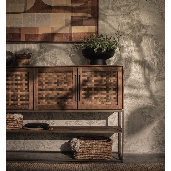 La credenza Karma Pure con 4 ante e 1 ripiano è un mobile alto realizzato a mano in teak e ferro di recupero, che offre un look elegante e vintage. Le sue quattro ante in teak riciclato splendidamente strutturato nascondono otto ripiani interni rimovibili per riporli facilmente, mentre il ripiano inferiore è perfetto per esporre i tuoi libri o cianfrusaglie preferiti. La struttura in ferro è rifinita in ottone opaco. Con le sue dimensioni di 205,5 x 40 x 110 cm, questo mobile è ideale per ampi spazi di archiviazione.
