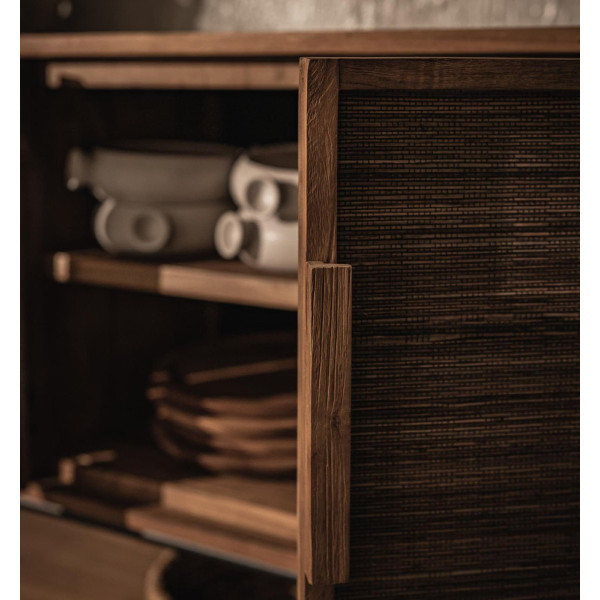 La credenza Coco con 4 ante e 1 ripiano è un mobile realizzato in legno di teak di recupero, ferro e tessuti intrecciati a mano dalla nervatura centrale delle foglie di cocco. Rettangolare, è un vero capolavoro che attira subito l'attenzione. Con le sue quattro ante e il ripiano aperto, l'unità è molto versatile. Una leggera angolazione sulla cornice in legno aggiunge al suo aspetto unico. Le dimensioni sono 170x40x100 cm.