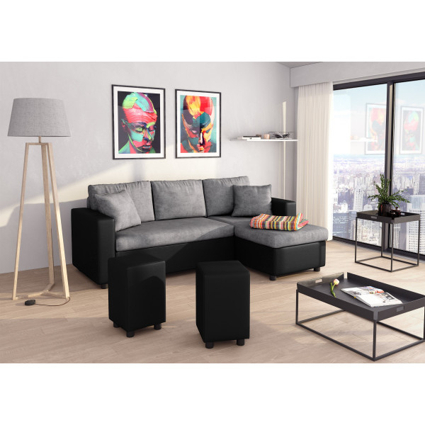 Con il suo design pulito e senza tempo, questo divano angolare Maria si integra facilmente in tutti gli stili di interni. Le sue funzioni sono molteplici: ampio vano contenitore, funzione letto trasformabile per ospitare 2 persone, ma anche una chaise longue reversibile che consente di modulare il divano e il soggiorno a proprio piacimento. Inoltre, è accompagnato da 2 pouf che permettono di moltiplicare le superfici di seduta. È il divano ideale per accogliere amici e famiglia! Le sue diverse varianti di rivestimenti e colori ti permetteranno di scegliere con precisione lo stile che corrisponde al tuo interno. Due piccoli cuscini tono su tono sono forniti per un maggiore comfort. Il divano è composto da microfibra per la parte grigia e da poliuretano per la parte nera. Il divano misura 223x86/146x82,5 cm e il letto 140x190 cm (densità di 27 kg/m³).