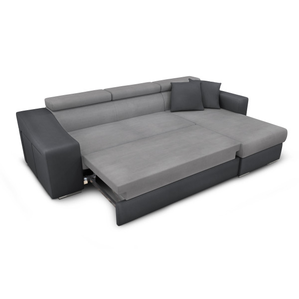 Questo grande divano angolare reversibile Stilo porterà uno stile moderno al tuo interno. Offre diverse funzionalità come una funzione letto per 2 persone, un ampio vano sotto la chaise longue e poggiatesta regolabili per offrirti il massimo comfort. Dispone anche di una nicchia fissa che permette di riporre i 2 pouf forniti per offrire 2 sedute aggiuntive. Due cuscini tono su tono sono forniti con il divano.