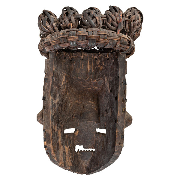 La maschera Mukinka Salampasu, caratterizzata da una fronte bombata decorata con bastoni in cerchio sormontati da sfere di vimini che formano un fitto copricapo. Il suo viso ha un naso svasato, denti a punta e una rete di fasce di rame, che evocano la cerimonia di guerra. Usate in occasione di funerali e iniziazioni, alcune maschere suscitavano una tale paura che il loro semplice nome spaventava donne e bambini. Misura 19,5x21x39 cm, questo pezzo unico è realizzato in legno, rame e rafia, risalente al XX secolo, questo pezzo unico è realizzato in legno, rame e rafia, originario dello Zaire nella tribù dei Salampasu.