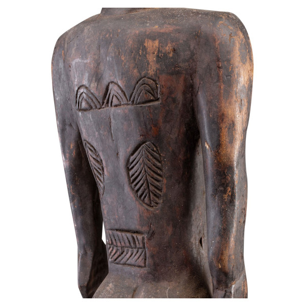 Questa statua della fertilità del popolo Bassa della Liberia, che misura 20x22,5x88 cm, è realizzata in legno naturale e metallo. Raffigura una donna con un intricato copricapo intrecciato e scarificazioni che indicano il suo status di iniziata o la sua maturità. Questi segni sul corpo sono spesso associati alla bellezza, alla fertilità e all'identità sociale. Questa figura unica, risalente alla metà del XX secolo, funge anche da protettrice, invocando lo spirito di un antenato per vegliare sui vivi, un ruolo centrale nelle pratiche spirituali e sociali della