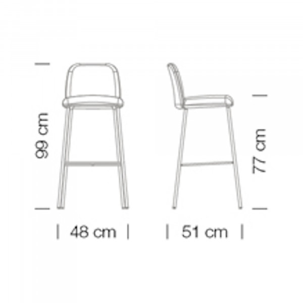 Lo sgabello Myra 654 del marchio et al. è dotato di seduta e schienale imbottiti. È realizzato con un rivestimento in tessuto e un telaio in acciaio da 4 piedi. Questo sgabello alto misura 48x51x99 cm. La seduta è alta 77 cm.
