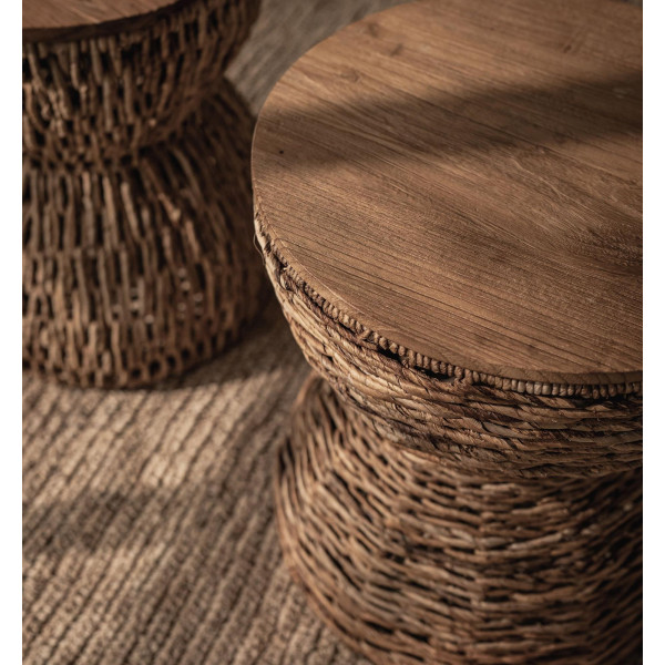 Il Rebana Alto è uno sgabello versatile a forma di tamburo che può essere utilizzato come seduta, tavolino da caffè o come decorazione, a seconda delle preferenze. Presenta un piano in legno di teak recuperato di alta qualità e una robusta struttura in filo metallico, completamente avvolta in corda di abaca biologica, realizzata a mano con l'antica tecnica giavanese. Con le sue dimensioni di 40 x 40 x 45,6 cm, è perfetta per aggiungere un tocco di stile e funzionalità a qualsiasi ambiente.