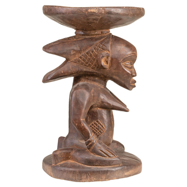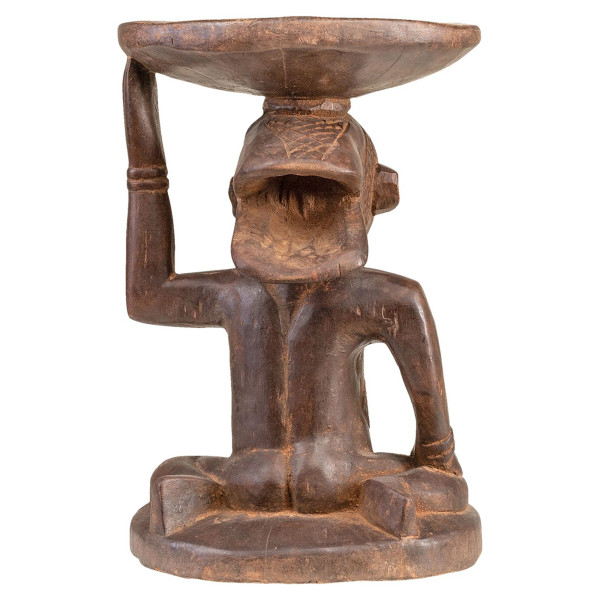 Sgabello Luba del XX secolo proveniente dalla Repubblica Democratica del Congo, questo pezzo di legno di 24x26,5x39 cm trascende la sua funzione di seduta. Un potente simbolo di potere, racchiude lo spirito del leader. Nonostante una società patriarcale, la linea femminile guida la successione, incarnata dalle cariatidi che onorano le antenate femminili. Una tradizione scultorea Luba, venerata dai leader reali.