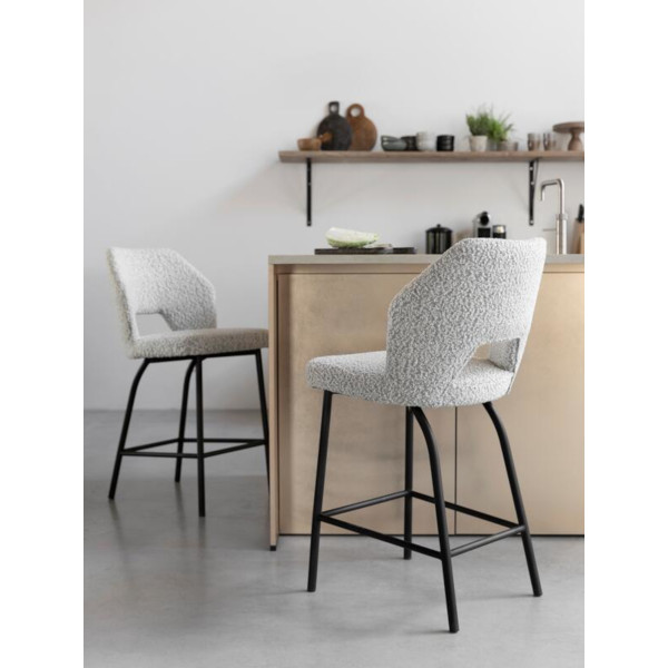 Ši stilinga Bloom baro kėdė su bouclé audiniu žavi savo moderniu dizainu ir nuostabiu paminkštinimu. Audinio ir metalo derinys suteikia šiai kėdei išskirtinę išvaizdą. Kėdės matmenys: 57x100x54 cm, sėdimosios dalies aukštis – 65 cm.