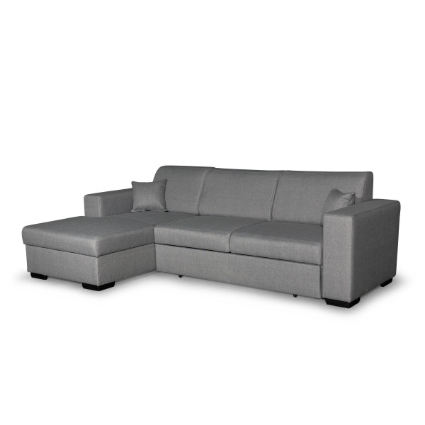 Ši didelė kampinė sofa-lova Caribi su nesenstančiu stiliumi suteikia tikrą sėdėjimo komfortą. Ji leis jums priimti visą šeimą ir apnakvindinti svečius dėl savo dvigulės lovos funkcijos. Taip pat yra didelis skyrius po šezlongu, kuriame galėsite laikyti pagalves, pledus... Su sofa yra du tonas į toną derantys pagalvės, kad būtų dar patogiau.