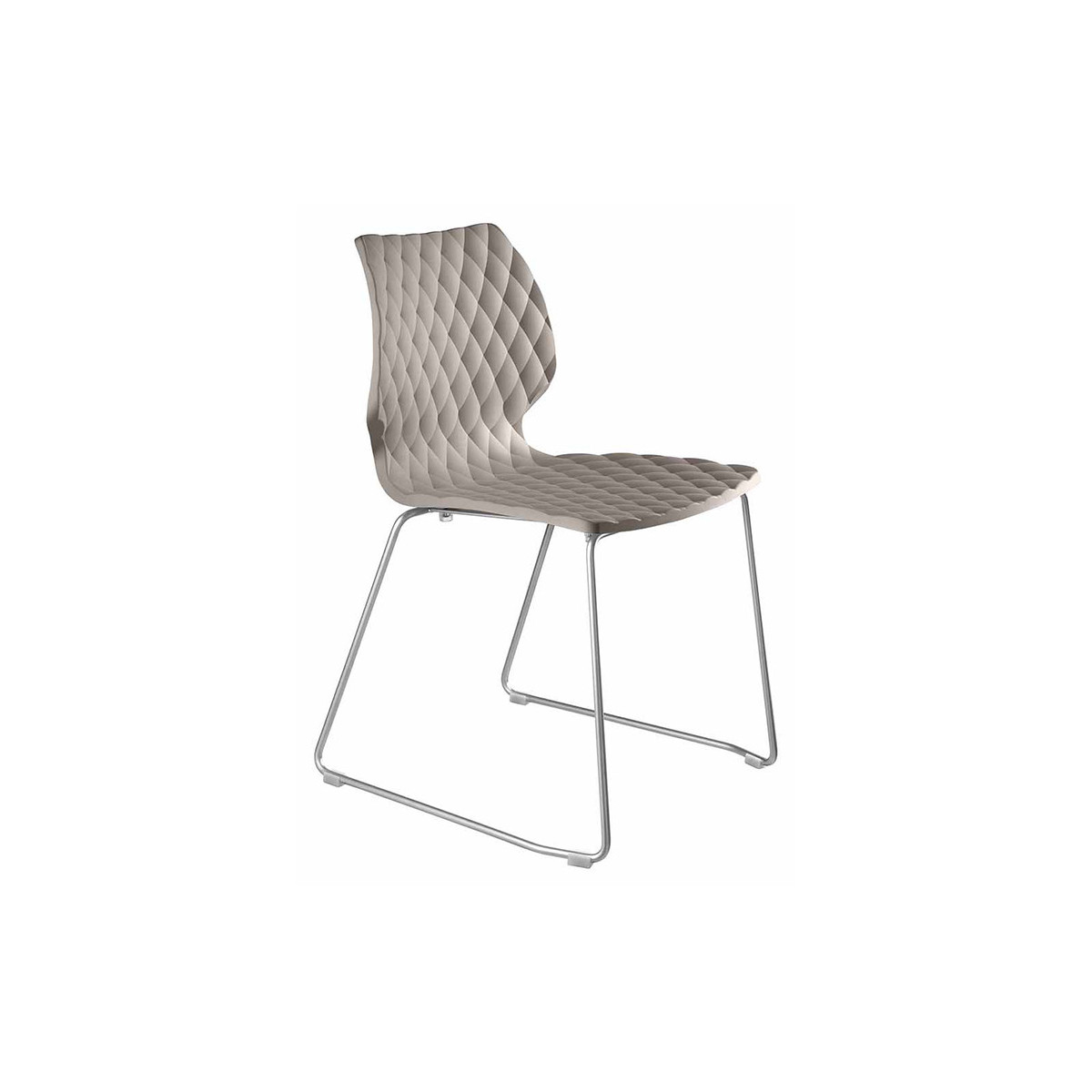 Kėdė, dizainas Francesco Geraci. Polipropileno sėdynė, plieninis rogių rėmas, sukraunama