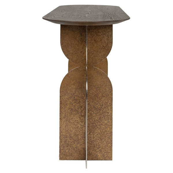 “Raya” konsolės stalo matmenys 46x140x80 cm ir yra pagamintas iš aukštos kokybės medžiagų, įskaitant plieną, ąžuolą ir MDF, derinio. Šis konsolinis stalas yra kavos ir bronzos spalvos, suteikiantis elegantišką ir rafinuotą išvaizdą. Kompaktiško dydžio ir aptakaus dizaino “Raya” konsolės stalas taip pat gali būti naudojamas įėjime ar prieškambaryje, kad namų dekoras būtų rafinuotas. Stalviršis apsaugotas nuo dėmių su 2 komponentų PU viršutiniu sluoksniu.