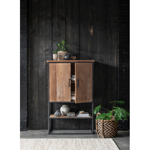 Natūrali ir žavi, Beam spinta yra pagaminta iš tikmedžio medienos ir turi metalinę struktūrą. Jos matmenys yra 90x40x140 cm, ji turi 2 duris ir atvirą lentyną.