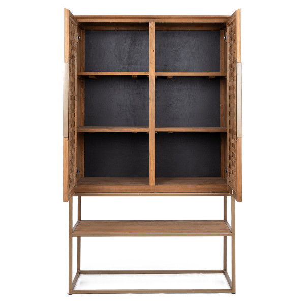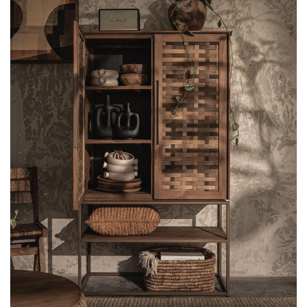 “Karma” drabužių spinta yra rankų darbo baldas, pagamintas iš regeneruoto tikmedžio, su dviem rankomis austomis tikmedžio durimis ir atviru skyriumi. Jo geležinis rėmas yra baigtas nuostabiu matiniu žalvario efektu, siūlančiu klasikinę ir rafinuotą išvaizdą. Elegantiškai struktūrizuotos durys viduje slepia šešias nuimamas lentynas, leidžiančias išlaikyti savo daiktus puikiai sutvarkytais. Vieneto matmenys 95x45x165 cm.
