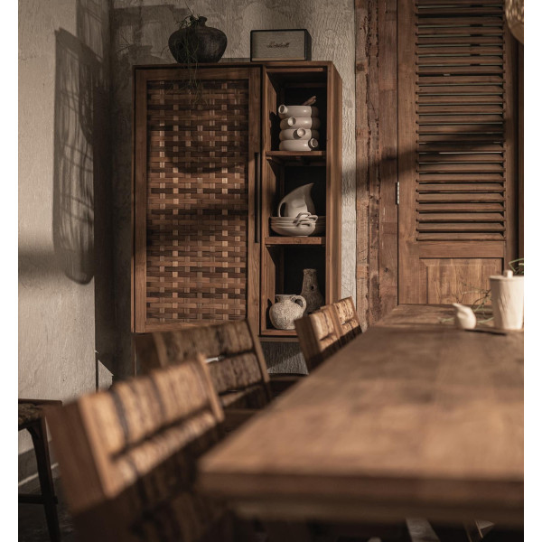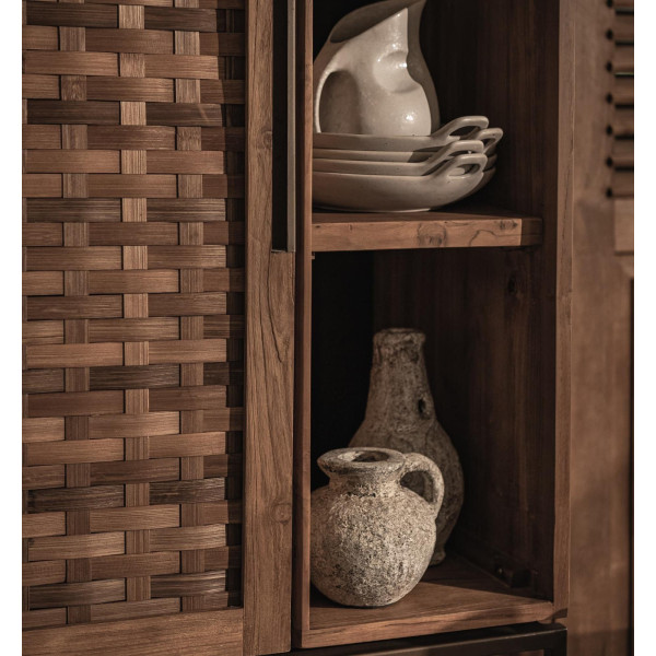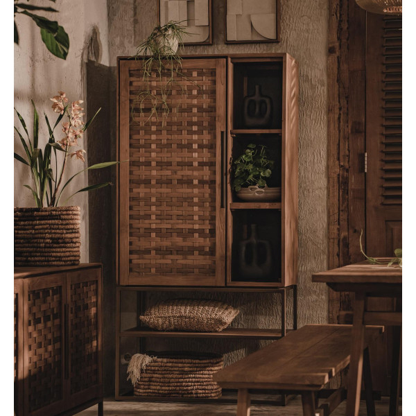 “Karma Pure” kabinetas yra elegantiškas ir daugiafunkcinis baldas, rankų darbo iš regeneruoto tikmedžio. Jame yra atviras stovas, trys atviros lentynos ir gražios durys, pagamintos iš rankomis austo tiko. Natūralios regeneruoto tikmedžio spalvos, kartu su geležiniu rėmu su matine žalvario apdaila, suteikia baldams turtingą pramoninį senovinį vaizdą. Jo matmenys yra 90x45x180 cm.
