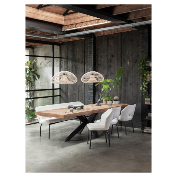Valgomojo stalas Einstein yra praktiškas ir draugiškas. Šis valgomojo stalas puikiai papildo interjerą. Jis turi masyvią rudą tikmedžio medienos stalviršį ir juodas metalines kojas. Šio stalo modernumas ir dizainas sužavės interjerą. Šio baldo bendri matmenys yra 220x100x77 cm.