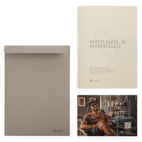 Devotion - Balancing board ir mākslas darbs, kas ir iedvesmojusi daba. Tas ir izgatavots no veco rīsu maisiņu gabaliņiem, kas savienoti kopā ar atkārtoti izmantoto audumu. Visa lieta ir izstiepta pa pārstrādātu koka rāmi, kas krāsots melnā krāsā, apdarināts ar ūdeni saturošu krāsu. Šī radīšana sastāv no divām gleznām, no kurām katra ir 27x5x37 cm, un tā ir ideāla, lai pievienotu ekoloģisku un māksliniecisku pieskārienu mājām vai birojam.