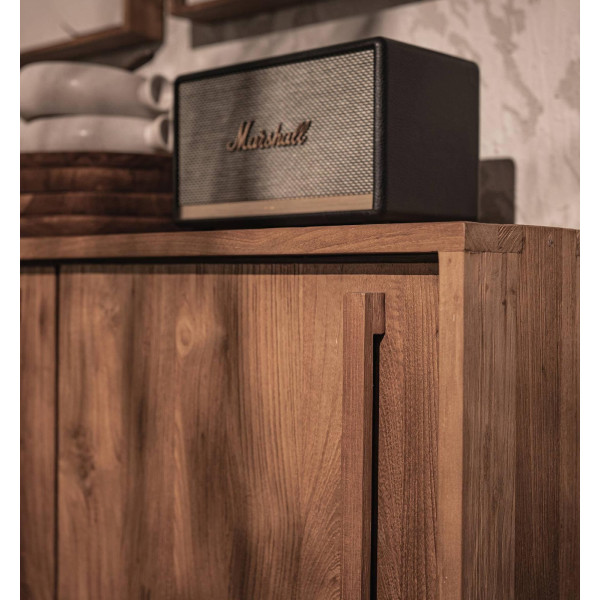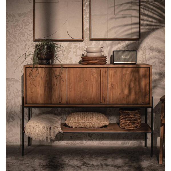 Šis kontūrs skapis ir moderna bufete ar tīru dizainu, kas viegli pielāgojas jebkuram interjera stilam. Šī mēbele ir roku darbs no reģenerēta tīkkoka un tai ir stilīgs dzelzs rāmis, kas pastiprina tā moderno retro izskatu. Aiz katras no trim durvīm ir divi plaukti, padarot to ideāli piemērotu trauku, rotaļlietu vai kaut ko citu uzglabāšanai. Tās izmēri ir 144x38x100 cm.