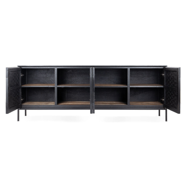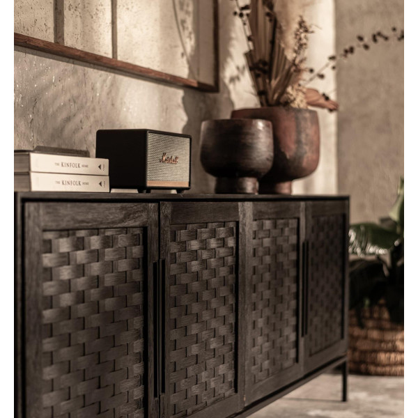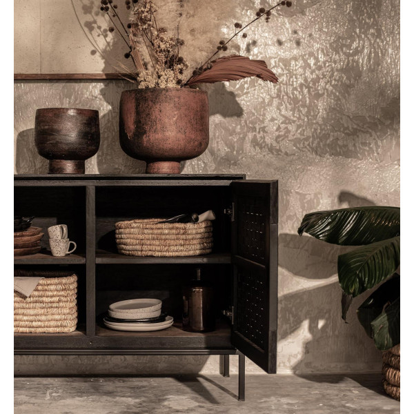 Karma bufete ar 4 durvīm ir skaists korpuss ar četrām durvīm no mūsu Karma kolekcijas, kas izgatavots, izmantojot dažādas amatniecības tehnikas. Korpuss ir roku darbs no reģenerēta koka, tam ir dzelzs kājas un izturīgas, ar rokām austas rotangpalmas durvis. Matēta melna ārējā apdare veicina vintage industriālo izskatu. Ar izmēru 200x40x75 cm, šī mēbele ir ideāli piemērota ikvienam, kas vēlas pievienot elegantu un zemniecisku pieskārienu