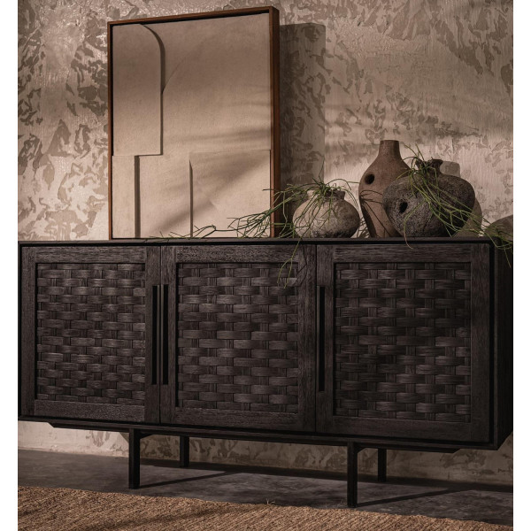Karma bufete ar 3 durvīm ir skaista mēbele, kas ir daļa no mūsu Karma kolekcijas. Šis trīsdurvju skapis ir veidots ar dažādām amatniecības metodēm. Roku darbs no reģenerēta koka, tam ir dzelzs kājas un skaisti strukturētas rokām austas rotangpalmas atvilktnes. Kāju rotaļīgā pozīcija papildina vintage pieskārienu gadsimta vidus iedvesmotajam dizainam. Ar izmēriem 151x40x75 cm, šis kumode ir ideāli piemērots jūsu apģērbu un aksesuāru uzglabāšanai elegantā un praktiskā veidā.