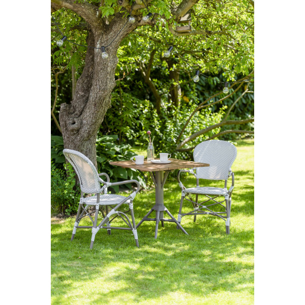 Ēdamistabas krēslam Isabelle Alu ir raksturīgs bistro stils. Izstrādāts Sika-Design, tas ir izgatavots no alumīnija un sintētiskās šķiedras (polietilēna) izmantošanai ārpus telpām un pievieno oriģinalitāti jebkurai telpai. Krēsls ir 54x92x57 cm. Šis krēsls ir sakrauj ar 2.