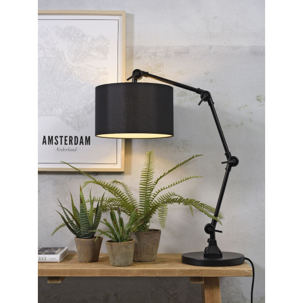 Galda lampa Amsterdam piešķir telpai patiesu pievienoto vērtību. Tā rada vienkāršu un elegantu atmosfēru. Tas ir neaizstājams elements lasīšanas stūrī vai birojā. Šis apgaismojums smalki izplata gaismu un rada siltumu un mājīgumu. Tam ir E27 ligzda (spuldze nav iekļauta). Lampas maksimālais platums ir 125 cm, un augstums ir regulējams no 43 līdz 110 cm.