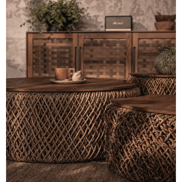 Knut Padi C kafijas galdiņu komplekts ir dažādu izmēru galdu komplekts, kas padara jautru pieskārienu jūsu mājām. Iedvesmojoties no lieliskajām Indonēzijas slaveno rīsu lauku formām, Knut Padi kafijas galdiņš rada iespaidu, ka tas sastāv no vairākām atsevišķām tabulām, kad patiesībā tas ir viens un tas pats kompakts objekts. Šis galds ir roku darbs ar pīti abakas virvi un reģenerētu tīkkoka. Tās izmēri ir 100x97x36 cm, 80x75x31 cm un 50x50x41 cm. Pievienojiet šo unikālo gabalu savai viesistabai, lai iegūtu oriģinālu dizainu.