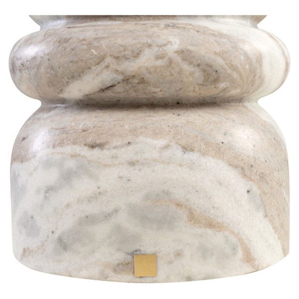 Ar izmēriem Ø30,5x40,5 cm šis gabals, ko izmanto kā kafijas galdiņš un izkārnījumi, ir mākslas darbs no marmora dabīgā marmora. Tās dizains izsauc marmora vēnu organisko skaistumu un bagātību, padarot to par unikālu un izcilu gabalu jebkurā interjera telpā. Tā kompaktais izmērs padara to par daudzpusīgu izvēli viesistabai, guļamistabai vai jebkuram citam jūsu mājas stūrim. Marmors piešķir interjera dizainam izsmalcinātību un eleganci, radot ievērojamu fokusa punktu. Šis kafijas galdiņš ir vairāk nekā tikai mēbele; tas ir māksliniecisks paziņojums, kas interjeram piešķir greznību. Marmora dabiskā rakstura un šī gabala rokām darinātās apdares dēļ ir iespējamas krāsas un struktūras variācijas.
