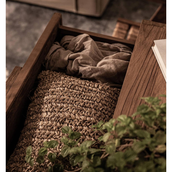 Šis Coco kumode ar 3 atvilktnēm ir mēbele, kas izgatavota no reģenerēta tīkkoka, dzelzs un roku darbs aušanas no kokosriekstu lapu vēnām. Šis īstas meistarības gabals nekavējoties aizķer aci. Kumode ir trīs plašas atvilktnes ērtai uzglabāšanai. Neliels leņķis uz koka rāmja papildina tā unikālo izskatu. Tās izmērs ir 79,5x40x100