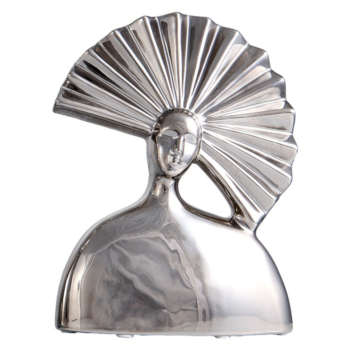Tas no Flosia zīmola ir seja ar vēdekļveida frizūru, tas ir unikāls un aizraujošs mākslas darbs, kas noteikti piesaista uzmanību un atstāj paliekošu iespaidu. Šī skulptūra ir izgatavota no keramikas ar spīdīgu hroma apdari, kas piešķir izsmalcinātību un oriģinalitāti jebkurai telpai. Tas ir pieejams trīs dažādos izmēros, no kuriem izvēlēties.