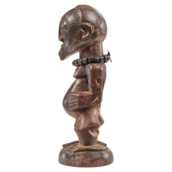 Šī klasiskā Hemba senča figūra ir ikonisks Hemba kultūras attēlojums. Ar rokām, kas novietotas uz nabas un dekorētas ar pērļu kaklarotu, viņa iemieso senču muižniecību un pastiprina ģimenes ciltsrakstu. Šie skaitļi tradicionāli tika izmantoti svarīgu ceremoniju laikā, kuru mērķis bija nostiprināt ģimenes stāvokli. Kā garīgā tvertne šī figūra atvieglo saikni starp mirušā un dzīvo pasauli. Šis unikālais darbs, kura izmērs ir 7,5x7,5x22,5 cm un izgatavots no koka un pērlītēm, liecina par Hemba kultūras māksliniecisko un garīgo bagātību.