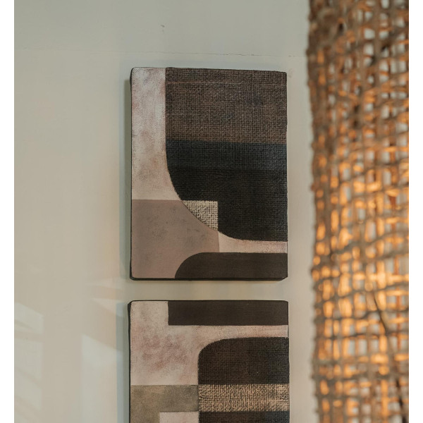 Het Devotion - Balancing board is een kunstwerk dat is geïnspireerd op de natuur. Het is gemaakt van stukjes oude rijstzakken, aan elkaar gebonden met hergebruikte jutestof. Het geheel is gespannen over een zwart gelakt gerecycleerd houten frame, afgewerkt met verf op waterbasis. Deze creatie bestaat uit twee schilderijen van elk 27x5x37 cm en is perfect om thuis of op kantoor een ecologisch en artistiek tintje te geven.
