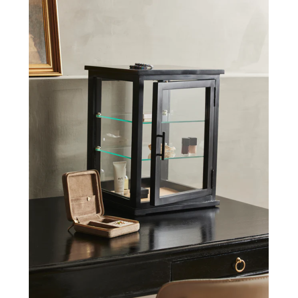 Deze Arno vitrinekast met een elegant en klassiek ontwerp is bedoeld als een decoratieve en praktische aanvulling op de bestaande huisinrichting. Eenvoudig en praktisch, met zijn twee glazen planken voor het opbergen van accessoires. Het is gemaakt van zwart geverfd mahoniehout en mangohout voor het interieur, dit alles zorgt voor robuustheid en duurzaamheid. Het meet 37x37x50 cm.