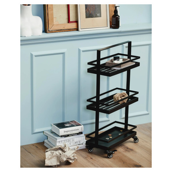 Om te serveren is deze Vollos-trolley met drie verdiepingen perfect voor het vervoeren van servies, drankjes, glazen of borden. Deze Vollos-wagen is praktisch en functioneel in huis dankzij de wielen. Het strijkijzer waaruit het bestaat, is robuust. Dit meubelstuk optimaliseert de ruimte en biedt veel opbergruimte. Het heeft een afmeting van: 20x42x80,5 cm. De zwarte kleur maakt hem chique en aantrekkelijk.