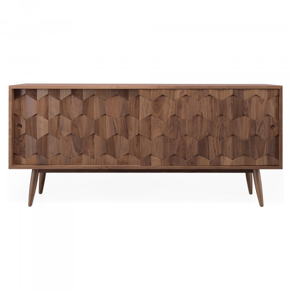 Het dressoir Scarpa biedt een uniek ontwerp, met twee lades en vier ruimtes. De twee schuifdeuren zijn gemaakt van stukken hout die zo zijn gerangschikt dat ze een dynamisch en driedimensionaal patroon creëren. Dit massief notenhouten meubel van het merk Wewood meet 186x45x84 cm.