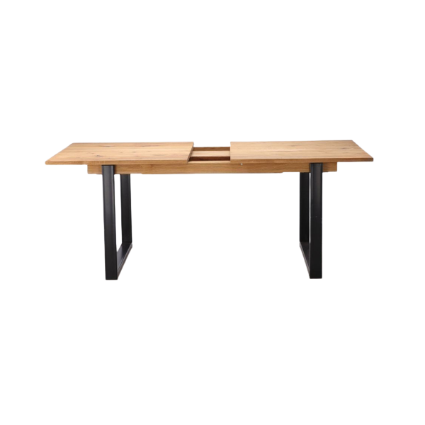 Deze uitschuifbare eettafel van Sierra combineert op harmonieuze wijze ijzer, eikenhout en spaanplaat om een veelzijdig en esthetisch meubelstuk te creëren. De bovenkant is gemaakt van natuurlijk eikenhout en biedt warmte en natuurlijke schoonheid, terwijl de structuur is gemaakt van stevig ijzer voor meer duurzaamheid en stabiliteit. Spaanplaat wordt gebruikt om het ontwerp te voltooien, wat zorgt voor een glad en egaal oppervlak. De natuurlijke en zwarte kleuren van deze tafel passen zich gemakkelijk aan verschillende interieurstijlen aan. De natuurlijke tint benadrukt de textuur en nerven van het hout, terwijl zwart zorgt voor een modernere en verfijndere uitstraling.