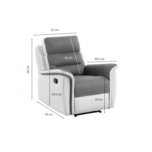 Deze relaxfauteuil is de ideale bondgenoot voor perfecte ontspanningsmomenten. Met een handmatige hendel kunt u in relaxmodus gaan door de voetensteun omhoog te brengen en de rugleuning tot 170° te kantelen. De hele zitting is gevuld met schuim, waardoor deze fauteuil ongeëvenaard comfort biedt. Het is de ideale fauteuil om te ontspannen, een dutje te doen, een boek te lezen of televisie te kijken. De fauteuil meet 88x93x96 cm met een zithoogte van 45 cm en een zitdichtheid van 28 kg/m³. De bekleding is gemaakt van kunstleer (polyurethaan) en microvezel voor een moderne en zachte uitstraling.