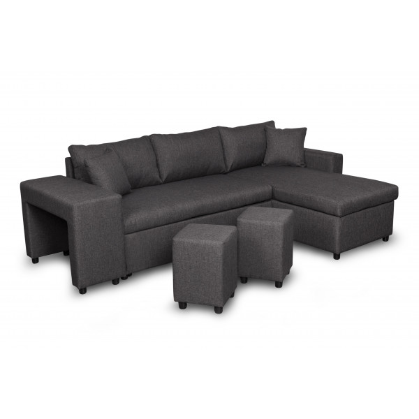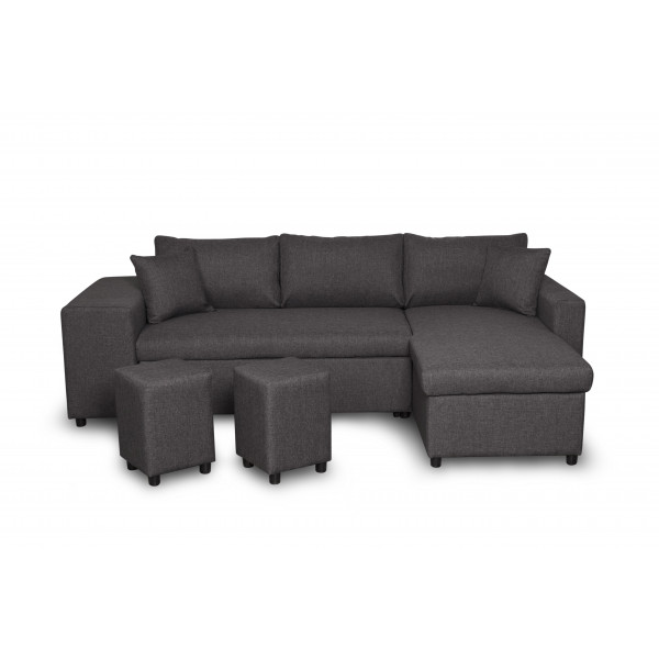 Linker hoekbank Maria Plus met vaste nis aan de linkerkant en 2 poefs, om te bouwen tot slaapbank