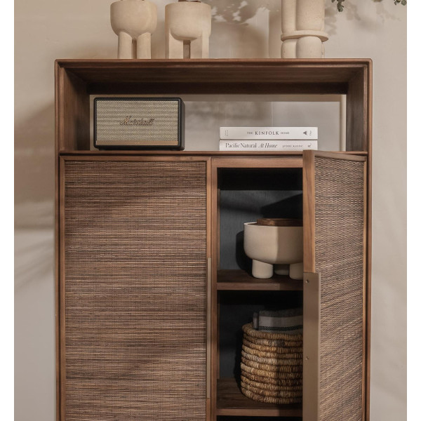 De Grace-garderobe met 2 deuren en 1 open plank combineert stijl en functionaliteit perfect in een strak, modern geïnspireerd ontwerp. De dubbele deuren zijn gemaakt van gerecycled teak en voelen aangenaam aan dankzij het gebruik van geweven kokosvezels, omlijst door teakhouten kralen en elegante koperen handgrepen. Met afmetingen van 90x40x160 cm kun je je spullen opbergen en tegelijkertijd een vleugje charme aan je huis toevoegen.