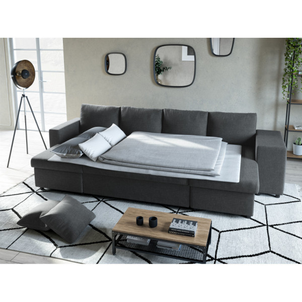 Maria U Plus converteerbare panoramische bank, nis aan de rechterkant, met 2 vakken en 2 stoffen poefs