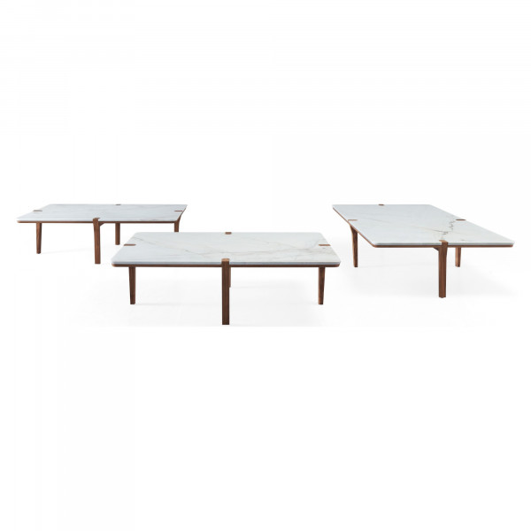 De rechthoekige salontafel Corner is ontworpen door de designer Pierre Dubourg om de klassieke positie van de poten van de meeste tafels te verstoren, door ze op plaatsen te zetten die stabiliteit garanderen en de hoeken vrij laten. Deze hoogwaardige tafel is gemaakt van poten en een basis van massief notenhout en een blad van marmer.