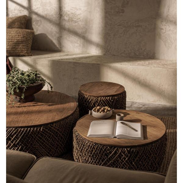 De Knut C placemat is een leuke set bestaande uit drie kleine tafels met de afmetingen 80x80x31 cm, 100x100x36 cm en 50x50x41 cm. Deze veelzijdige stukken kunnen worden gebruikt als tafels, poefjes of ter decoratie. Als de bovenkant is verwijderd, kunnen ze zelfs als mand worden gebruikt. De tafels zijn gemaakt van milieuvriendelijke materialen, met de zijkanten versierd met handgevlochten abacavezels en een verwijderbaar blad van teruggewonnen teakhout.