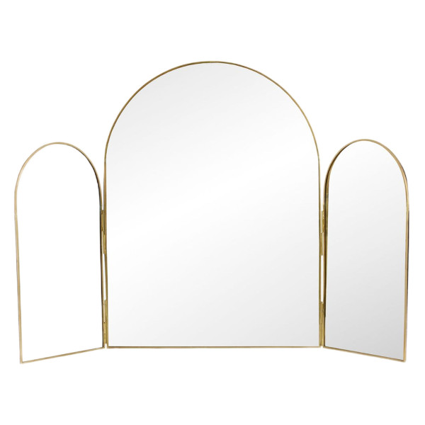 Deze gouden tafelspiegel van Rukia zorgt voor een interessante en zeer aangename visuele balans in een interieur. De roestvrijstalen structuur zorgt voor een gezellig en warm interieur. Dankzij de twee vleugels kan hij in- en uitgeklapt worden. Deze spiegel meet 77x0,5x51cm.