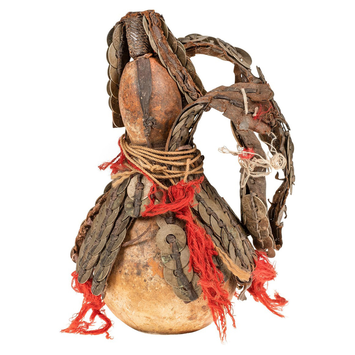 Ta butelka leku, pochodząca z XX wieku i pochodząca z plemienia Ere Ibeji-Yoruba w Nigerii, zawiera niezbędne składniki lub niezbędne mikstury. Jego korek, charakterystyczny monetami i metalowym sznurkiem, świadczy o wyjątkowym kunszcie różnych rzeźbiarzy. Ten funkcjonalny i dekoracyjny obiekt o wymiarach 13x15x23,5 cm odzwierciedla bogactwo kulturowe i różnorodność artystyczną regionu.
