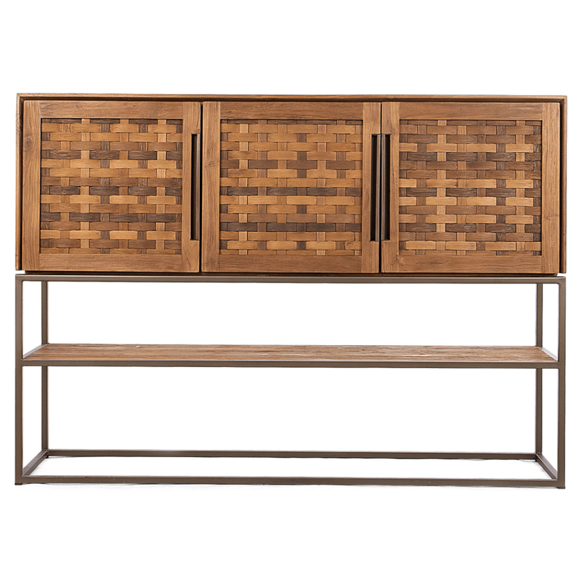 Komoda Karma to elegancki, zabytkowy mebel wykonany ręcznie z odzyskanego drewna tekowego i żelaza. Trzy odzyskane drzwi z drewna tekowego mają piękną fakturę i ukrywają sześć wyjmowanych półek ułatwiających przechowywanie. Dolny stojak jest idealny do wyświetlania ulubionych książek lub bibelotów. Żelazna rama wykończona jest matowym mosiądzem. Urządzenie mierzy 155x40x110 cm.