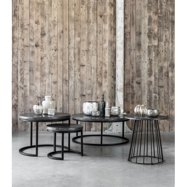 Okrągły stolik pomocniczy MUST Living Mont Blanc ma blat z czarnego bazaltu i metalową konstrukcję. Wymiary stolika to Ø45x48 cm.