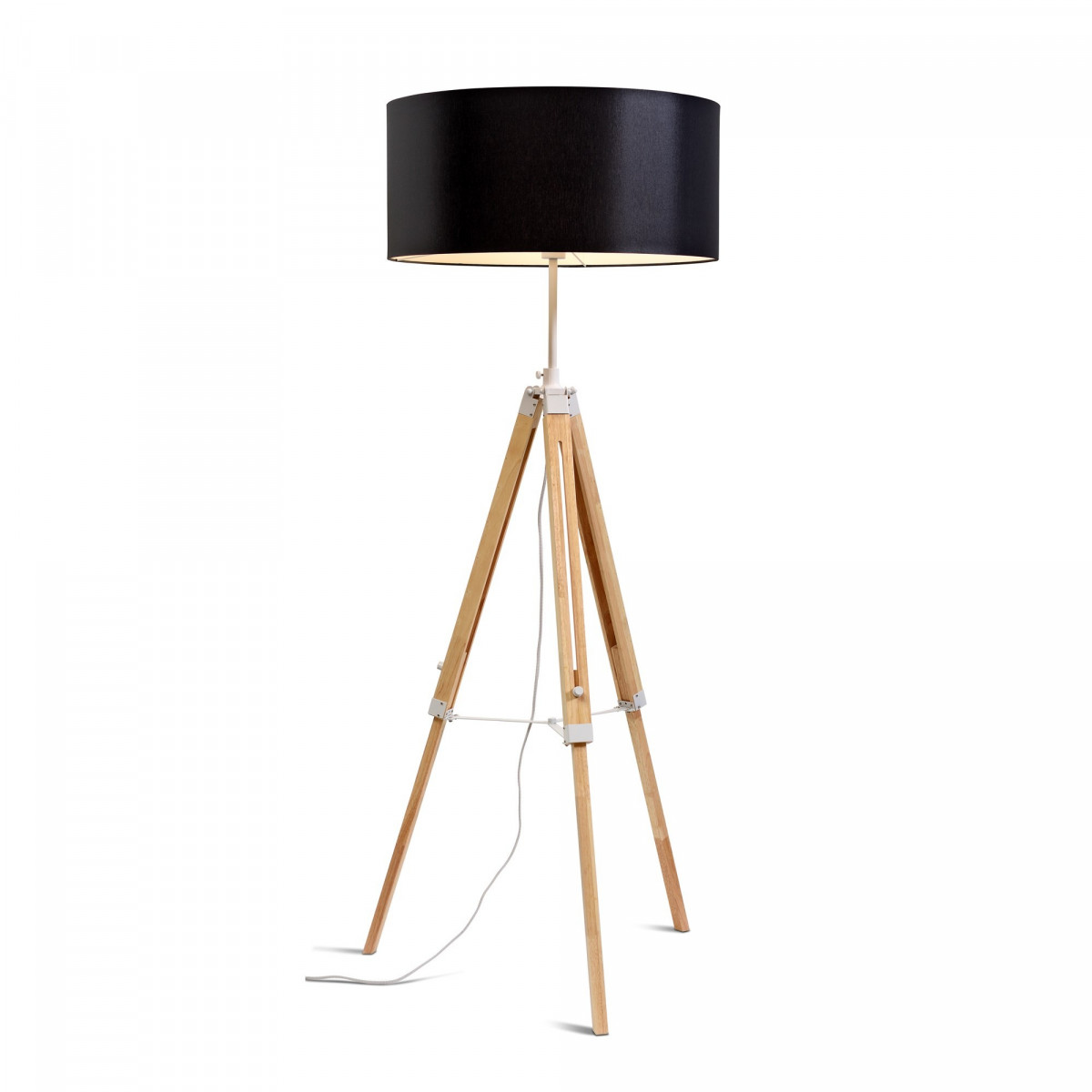 Lampa stojąca Darwin, zaprojektowana z białego żelaza, drewna i bawełny, wnosi do wnętrza nowoczesny akcent. Charakteryzuje się oryginalnym designem oraz regulowaną wysokością od 143 do 173 cm i szerokością 70 cm. Abażur ma średnicę 60 cm i wysokość 30 cm. Ta lampa stojąca posiada oprawkę E27 (żarówka nie jest dołączona).