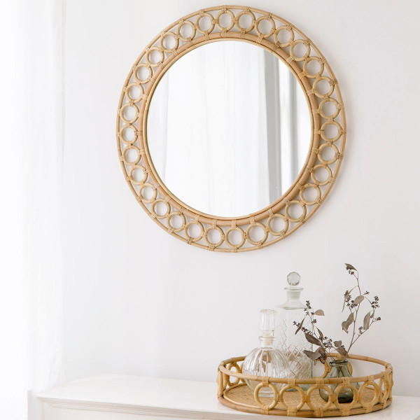 Mira, ozdobne lustro Sika-Design, ma piękne wiklinowe detale, wszystkie wykonane ręcznie z indonezyjskiego rattanu. Idealne do przedpokoju wejściowego, małej łazienki lub jako element dekoracji ścian w salonie, to lustro ma średnicę ø70 cm.