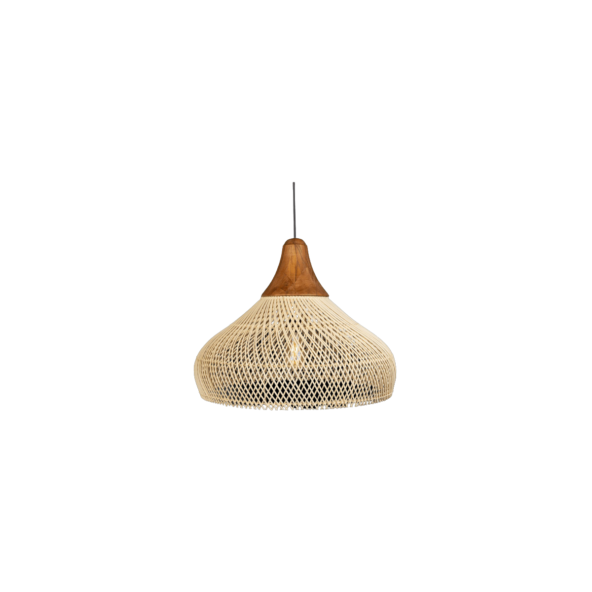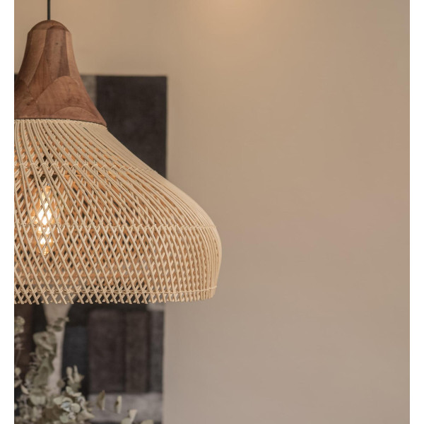 Lampa wisząca Tuba to naturalna interpretacja klasycznego oświetlenia wiszącego. Posiada blat z drewna tekowego i organicznie ukształtowane, ręcznie tkane detale rattanowe z boku, wykonane starożytnymi technikami jawajskich. Dostępne w różnych rozmiarach i wykończeniu naturalnym lub węglem drzewnym. Można go zawiesić samodzielnie lub w klastrze, mieszając różne kolory i kształty. Jego rozmiar to 60x60x48 cm.